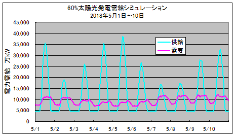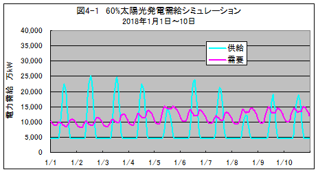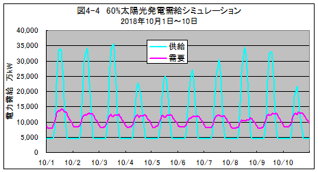 太陽光発電の比率が20数%に達すると、そのピーク時の発電電力は、他の電源をゼロにしても、電力需要を上回り、過剰電力を電力貯蔵することが必要になると推測されます。