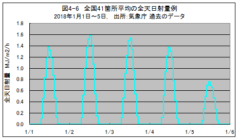 ③ 日本全体では晴れた地域もあれば曇った地域もあり、PV発電量の変動は平準化されます。日射量が報告されている全国41地点について、各々PV設置容量のデータがあれば、日射量の荷重平均をすべきです。