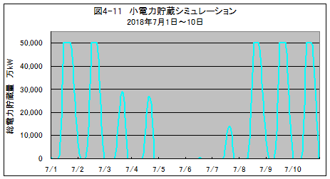 ここでは、合計の電力貯蔵容量が5億kWh(500GWh)の小電力貯蔵設備と、その電力貯蔵量が上限に達した場合の充電と、貯蔵量がゼロになった場合の放電は、大電力貯蔵設備で充放電するものとしてシミュレーションを行いました。