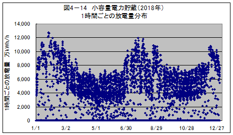 このシミュレーション結果では、各々小容量と大容量の電力貯蔵の年間の充放電量は、ほぼ同量の約1,500億kWhになっています。