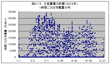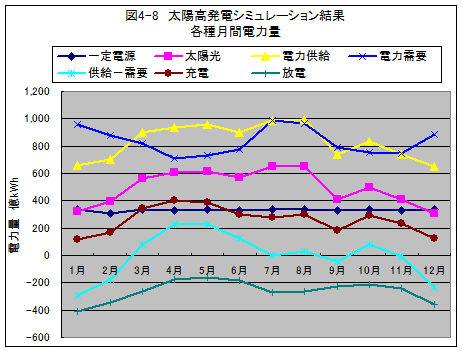 電力需給が均衡しない場合には、電力貯蔵設備を設け、充電か放電で調整することが必要になります。図4-8には、月々の充電だけと、マイナスで示した放電だけを各々合計して示しました。