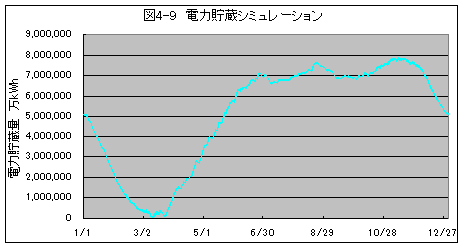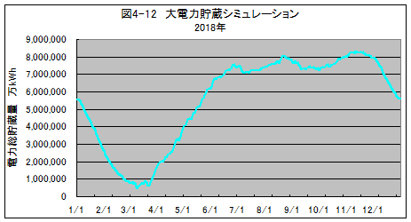 図4-9のデータにはPVの昼夜の発電変動も含まれていますが、グラフでは殆ど認識できない小さなギザギザで示されています。それに対し、季節による電力貯蔵量の変動は800億kWh(80,000GWh)近くで、非常に大きいことが分かります。