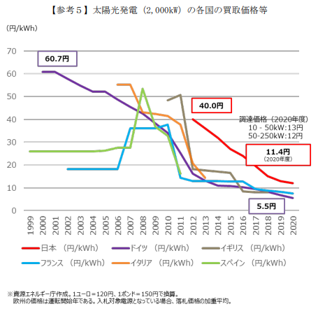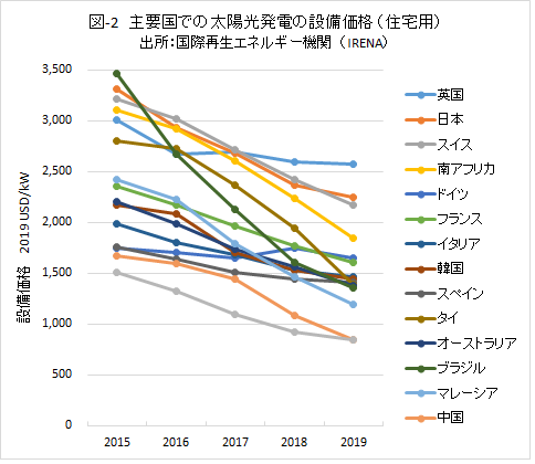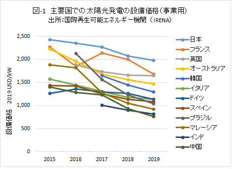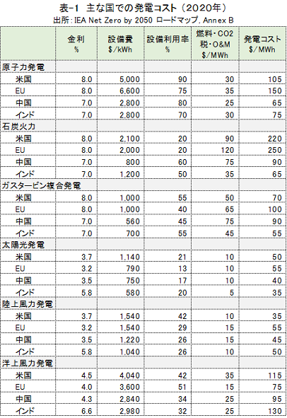 菅首相は温暖化対策として、2050年までに排出量実質ゼロ、2030年までに46%削減を表明しました。当初戸惑っていた産業界も、それに向かって動き出したことを感じます。 排出量実質ゼロは、産業革命以降250年続いた世界を大変革する痛みを伴う極めて困難な課題です。 CO2排出量実質ゼロの達成は、消費エネルギーを極力電力化し、電力を脱炭素化することが基本になります。脱炭素電源の中心は太陽光発電と風力発電です。日本は陸上の風力発電立地が乏しく、着床式洋上風力発電を設置できる水深50m未満の遠浅の海岸が乏しいため、太陽光発電への依存が高くなります。 <日本の太陽光発電の設備価格は世界最高レベル> しかし、日本の太陽光発電は、主要国の中で設備単価が群を抜いて高いのです。下図は、国際再生可能エネルギー機関(IRENA)の下記レポートのデータを図示したものです。なお、輸入関税等で問題がある米国のデータは除きました。 Renewable Power generation Costs in 2019 ![]() ![]() 2019年日本の発電電力量の7.4%を占める太陽光発電は、事業用(非住宅用)が容量比で約86%、住宅用が約14%を占めています。 IRENAに報告された日本の太陽光発電の設備単価は、例えば、ドイツの事業用の約1.8倍、住宅用は約1.4倍です。 <FITの失敗を繰り返すな> 日本の再エネ電力の固定価格買取制度(FIT)では、太陽光発電の海外との大きい価格差をそのままに、下図に示すように、高い買取価格が設定されてきました。 ![]() 東日本大震災のあと政治主導で導入されたFITは、2020年度の買取費用総額が約3.9兆円、賦課金だけで2.4兆円に達しています。 制度開始を少し遅らせ、太陽光発電の設備価格を世界相場に近づくように誘導した上で、開始すべきだったのです。 因みに、FITの法律の附則第七条には、次のように記載されています。 「経済産業大臣は、集中的に再生可能エネルギー電気の利用の拡大を図るため、この法律の施行の日から起算して三年間を限り、調達価格を定めるに当たり、特定供給者が受けるべき利潤に特に配慮するものとする。」 2030年の排出量46%削減に関し、環境大臣は太陽光発電をできる限り導入すると述べています。導入費用を負担するのは、住宅屋根用なら住宅所有者、事業用メガソーラーなら電気料金に盛り込まれ電気利用者が負担することになります。 太陽電池モジュールは世界的に取引されている商品ですから、日本が異常に高くなるはずはありません。太陽光発電の大量導入に先立ち、日本の太陽光発電の設備価格を、世界水準に近づける努力をしてもらいたいものです。FITの失敗を繰り返さないよう願います。 <変動再エネ電源の発電コスト> 最新の太陽光発電や陸上風力発電の発電コストは、既存の石炭火力の限界費用よりもかなり低くなっている、という記載を目にします。太陽光や風力発電は、発電コストが高いと考えていた方は驚くと思います。その情報は、英国の非営利シンクタンクCarbon Trackerの一連のレポートがもとになっているようです。 太陽光や風力発電が増加した結果、多くの国で電力供給容量が過剰になっています。各種電源の運用では、太陽光発電や風力発電などの変動再エネ電源は停止されることはなく、過剰電力の発生を避けるには、石炭火力の停止や調整運転が行われます。その結果、石炭火力の設備利用率は著しく低下しています。 加えて、石炭火力は、環境規制を満たすため改造費や、CO2税などの環境対策運転費の増加があります。また、環境対策の設備改造は、設備停止を増加させます。 既存の石炭火力は、設備利用率の低下と運転費の増大により、発電コストが大幅に増加しています。一方、太陽光や陸上風力発電は発電コストが低下しており、石炭火力との関係が逆転しているといるという主張です。 IEAのロードマップのAnnexにも、同様の趣旨で、2020、2030、2050年の発電コストが掲載されており、実績を反映したものと思われる2020年の値を下表に示しました。 ![]() 但し、上表の太陽光発電や風力発電など変動再エネ電源の発電コストには、発電変動の対策費用が含まれていません。 例えば、太陽光発電だけで自立した社会を考えると、夜間の電力供給のために蓄電池が必要になり、雨天曇天が長期に続く場合や、太陽光発電の発電量の季節変動に備え対策が必要になります。 電力システムで、変動再エネ電源の比率が低い段階では、その他の電源の運転を調整することで、変動再エネ電源の発電変動を吸収できます。しかし、変動再エネ電源の比率が増加すると、発電変動の対策が必要になり、対策費は急速に増大します。例えば、電力網の増強、電力貯蔵設備の設置、変動運転ができるバイオ燃料や水素などの脱炭素燃料の火力発電などが必要になります。それらの費用は、変動再エネ電源の導入コストと見做すべきで、別途にその種の検討も行われています。 太陽光と石炭の何れの発電コストが低いかは別にして、温暖化への世界の取り組みのもとで、石炭から太陽光や