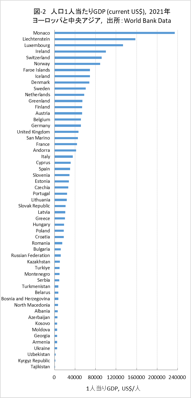政治経済の面でウクライナの特徴を、「欧州で最も貧しい国の一つで汚職大国」とする表現がみられます。図-2には、ヨーロッパに中央アジアを加えた国々について、2021年の人口1人当たりのGDPを示しました。データが無い小国3カ国を省略し、2020年と2019年データで代替した3カ国が含まれています。下から4番目がウクライナです。報道映像では、ウクライナがそれほど貧しく見えないのは、物価が安いためかもしれませんが、GDPからはこのような評価になります。