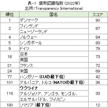 表-1には、Transparency Internationalが公表している2022年の腐敗認識指数を示しました。順位が116番のウクライナとともに、腐敗の少ない上位5か国、主要国、EU加盟国のラスト、NATO加盟国のラストなどを示しました。ウクライナの汚職問題は、NATO加盟基準を満たせない代表的な事項です。